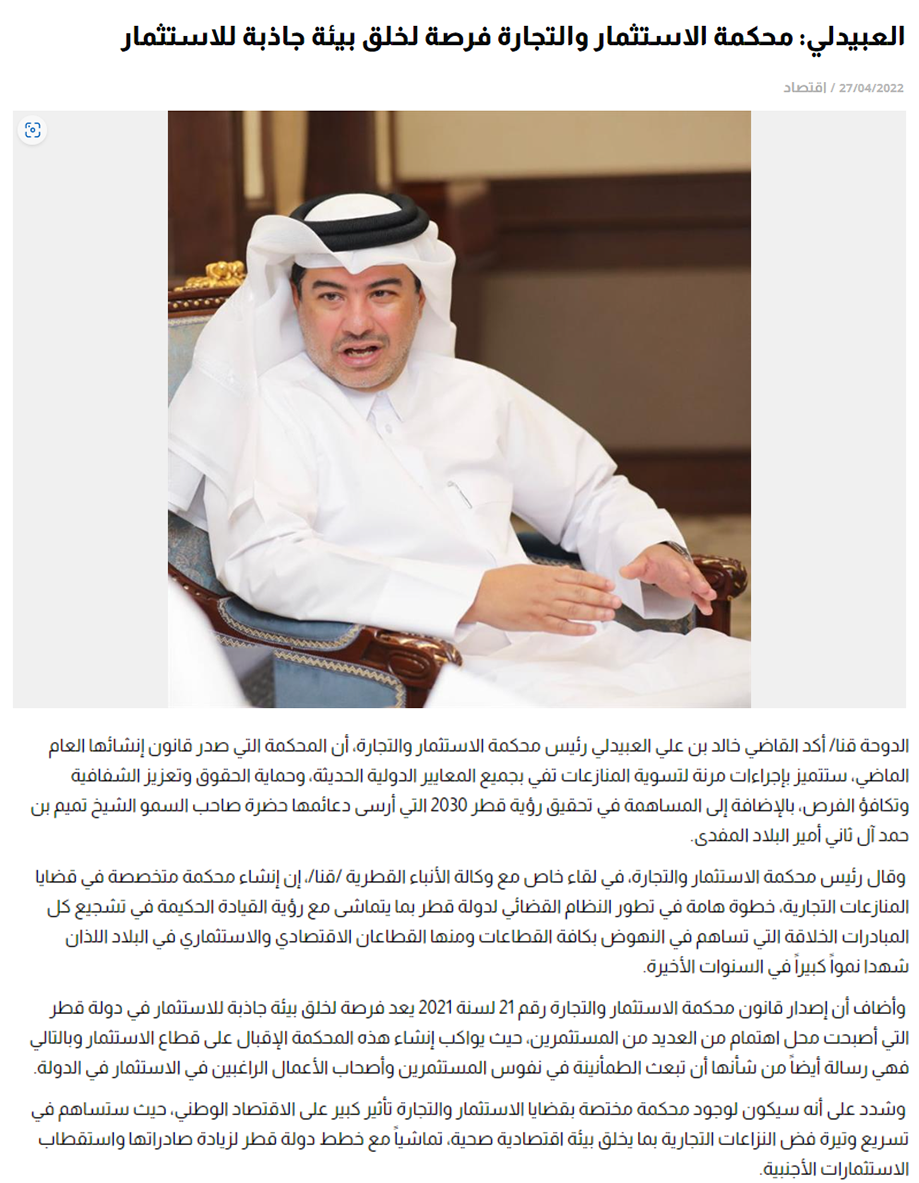 العبيدلي: محكمة الاستثمار والتجارة تخلق بيئة جاذبة للاستثمار