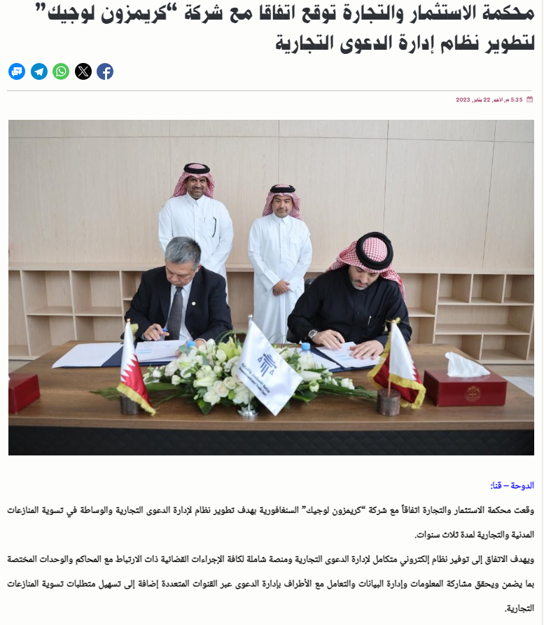 محكمة الاستثمار والتجارة توقع اتفاقا مع شركة "كريمزون لوجيك" لتطوير نظام إدارة الدعوى التجارية