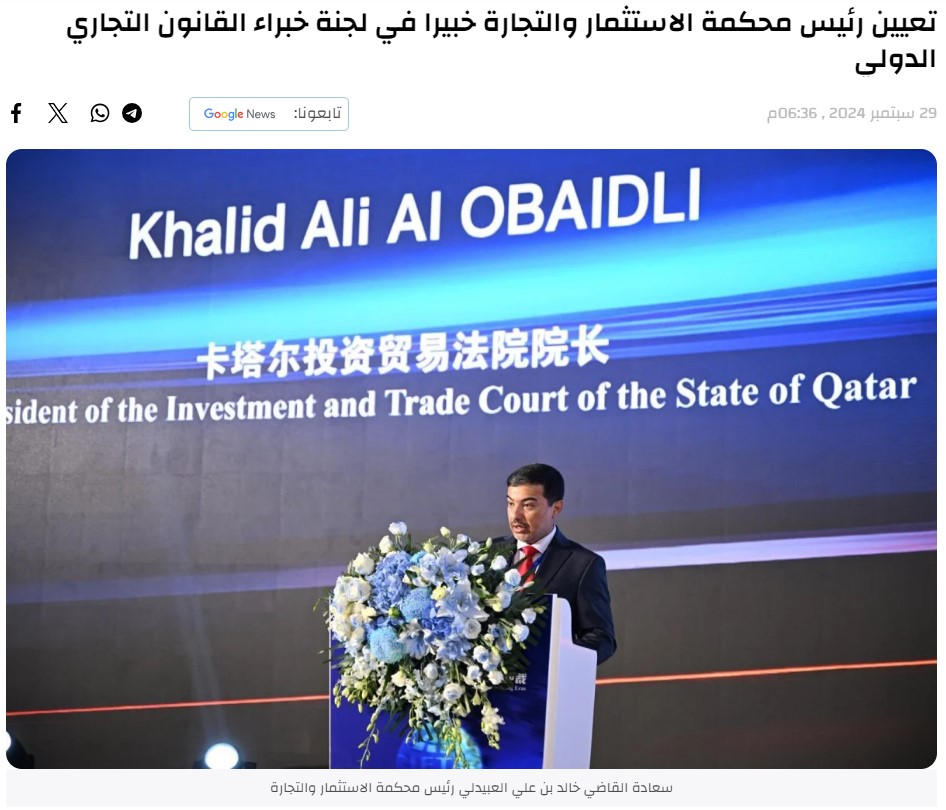 تم تعيين سعادة القاضي خالد بن علي العبدلي، رئيس محكمة الاستثمار والتجارة، خبيراً في لجنة خبراء القانون التجاري الدولي